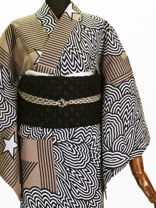 メンズ ポリキモノ 縞ボタン・市松1(グレー)