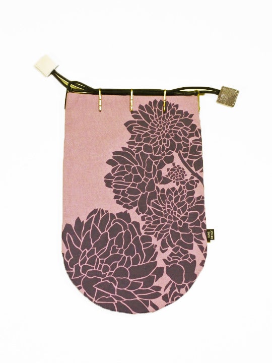 袋の口に専用のコキといわれるパーツを取り付けた熟練職人の手作業による巾着。
