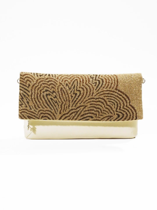 二つ折クラッチ 24-03-03箔モール縞ボタン ゴールド×ブロンズ(革シロ)