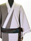 業界でもまだまだ珍しいジャージキモノは、2012年に商品化されました。発案者は、斉藤上太郎の父で“現代きもの作家の第一人者”の斉藤三才。デニムに続く、新素材のキモノとして開発、発表いたしました。発売当初は未知数でしたし、「ジャージ」のイメージが先行してキモノと結びつかないかたも多かったのですが、着心地の良さで大ヒット。今ではデニムキモノと人気を争うJOTAROの定番商品となりました。色柄、素材はその都度変更して生産。ラインの入り方や太さ、色もその時期により微妙に変わります。ジャージらしさをあえて残しているのも、デザイナーのこだわりです。