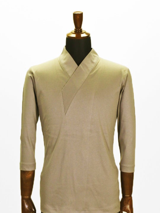 長襦袢の代わりにお使いいただけるキモノ衿カットソー。お洋服感覚で洗濯機でお手入れ可能な手軽さと、半衿を縫う手間いらずで、画期的と大好評。キモノからカットソーが出ないように7分袖にしております。衣紋が抜けないため、男性専用となっております。キモノをよく着られる方や、仕事としてキモノを着る方にも重宝されております。長襦袢の代わりとしてはもちろん、ジャケットのインナーとしても使う方も。キモノ好きな方へのプレゼントにも喜ばれます。