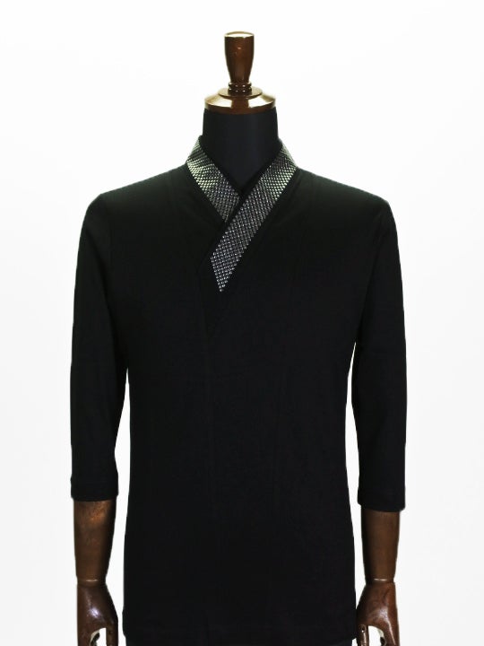 長襦袢の代わりにお使いいただけるキモノ衿カットソー。お洋服感覚で洗濯機でお手入れ可能な手軽さと、半衿を縫う手間いらずで、画期的と大好評。キモノからカットソーが出ないように7分袖にしております。衣紋が抜けないため、男性専用となっております。キモノをよく着られる方や、仕事としてキモノを着る方にも重宝されております。長襦袢の代わりとしてはもちろん、ジャケットのインナーとしても使う方も。キモノ好きな方へのプレゼントにも喜ばれます。